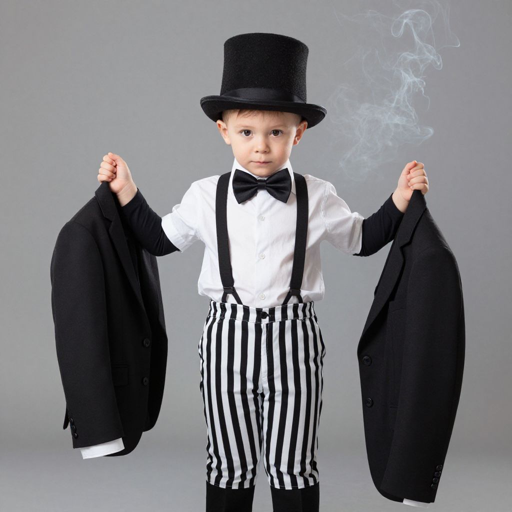 Toddler magic magician, male focus, 1boy, solo, hat, striped pants, bowtie, top hat, bow, pants, holding, jacket, black bowtie, black bow, looking at viewer, vertical-striped pants, striped clothes, black headwear, black jacket, white shirt, shirt, standing, long sleeves, smoke, closed mouth, black pants