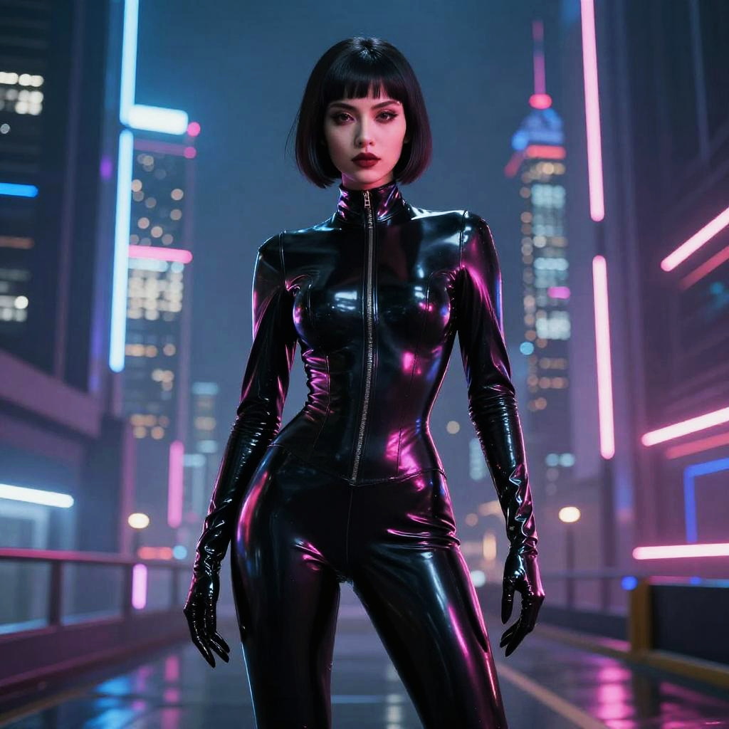 Photorealistic digital art depicts a woman with a pale skin tone and short black bob haircut, standing confidently in a neon-lit, futuristic cityscape. She wears a tight, black, glossy latex catsuit with a high collar and zipper, along with matching latex gloves. Her dark red lipstick contrasts with her pale skin. The background features tall buildings with brightly colored neon lights in blue, pink, and purple, creating a cyberpunk atmosphere. The scene is illuminated by vivid, multicolored lights reflecting off her latex outfit, highlighting its shiny texture. The woman stands in the center, looking directly at the viewer with a serious expression.