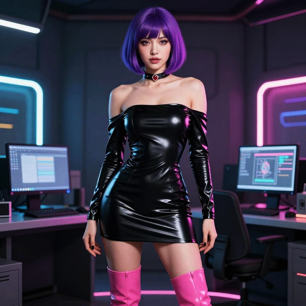 CGI image of a pale-skinned woman with a black bob haircut, wearing a shiny, black latex catsuit with gloves, standing in a neon