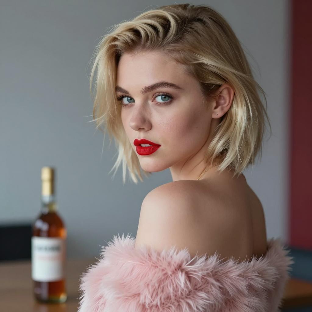 Blonde woman with short hair and pink fuzzy coat, looking over her shoulder with intense gaze. Background: blurred bar setting with bottles and glasses. Bottle in foreground. Blue and green lighting.