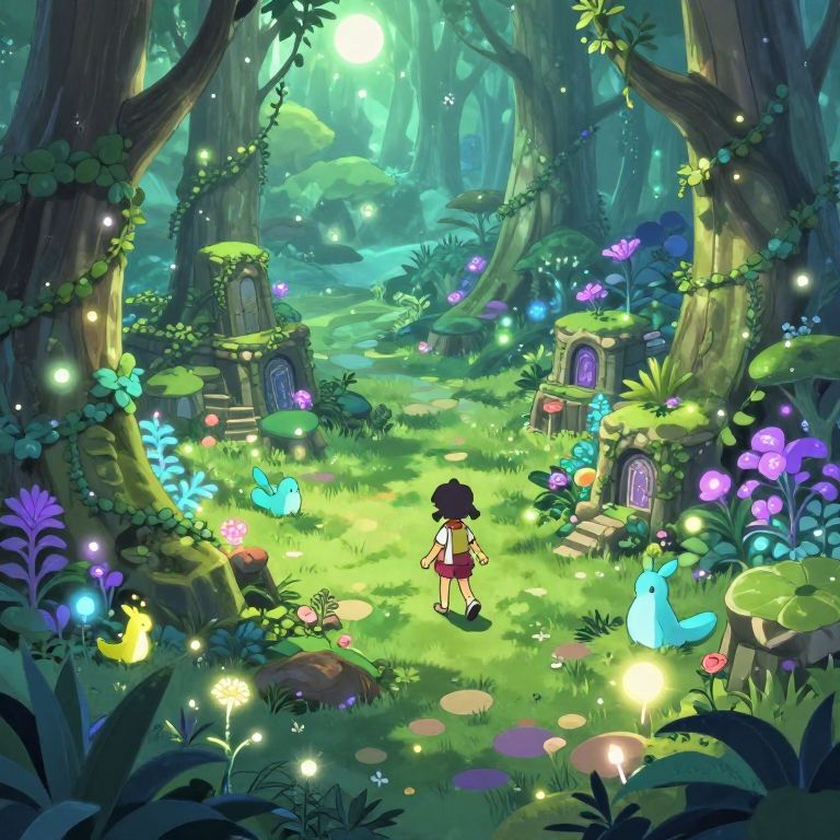 Isometric anime fantasy forest, mystical and lush, glowing flora and magical creatures, ancient ruins covered in vines, bright mystical lights, highly detailed textures, charming anime character exploring, a sense of wonder and adventure in vibrant greens and purples.