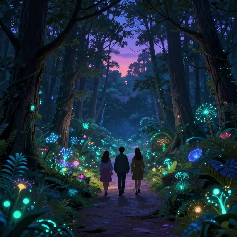 Dreamers walking along a glowing path through an enchanted forest under a twilight sky, bioluminescent plants lighting the way, magical realism style, rich colors, detailed environment, mysterious and hopeful ambiance
