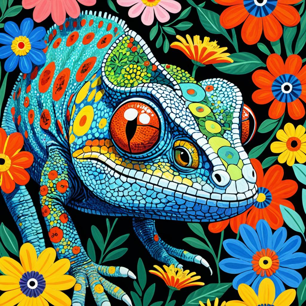Acrylic gouache pop art portrait of chameleon, surrounded by colorful flowers, big smile, looking directly at camera, in Pixar style, high detail on eyes and face, zoomed out for full view, inspired by Sonia Delaunay