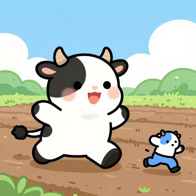 Cute digital drawing of a black-and-white cartoon cow running joyfully on a dirt field, with a blue-and-white chick chasing behind under a bright