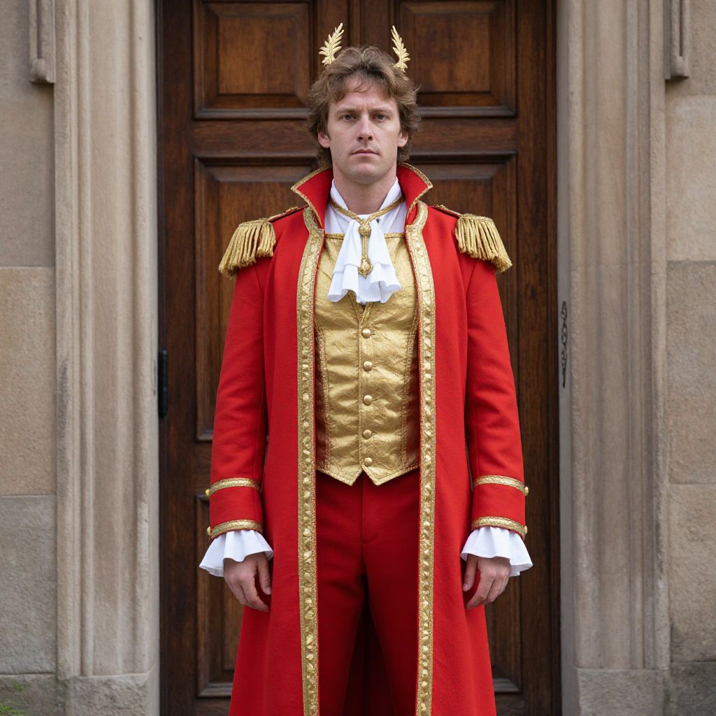 Photograph of a young man with curly brown hair, wearing a red and gold regal outfit with white cravat, standing in front of a