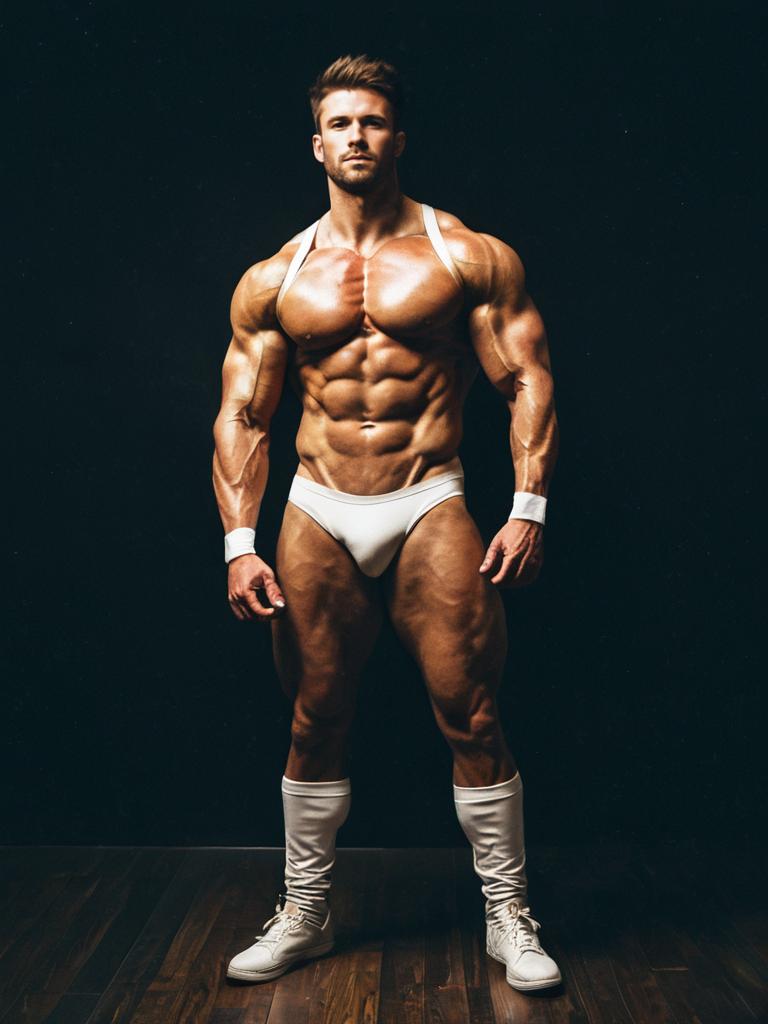 Man in Buff Male Costume, cinematic realism, comedic cosplay editorial photo --sref 1390