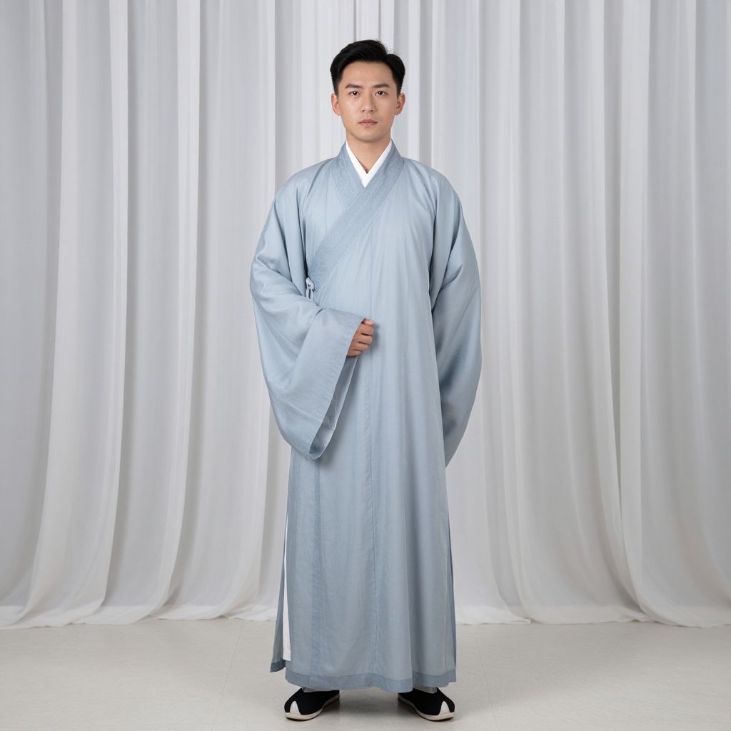 Costume Grown, man in traditional chinese clothing standing in front of a white curtain
