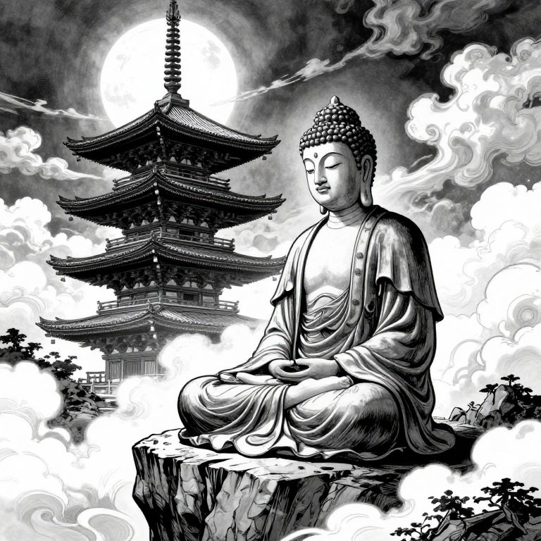 The image is a stunning black-and-white illustration of a Manga-style epic scene, reminiscent of the work of Hokusai and Moebius. The central figure, a Buddha, is depicted in a meditative pose, seated on a rocky cliff overlooking a majestic pagoda. The Buddha's robes are intricately detailed, with folds and textures that add depth and realism to the figure. The pagoda, with its multiple tiers and ornate architecture, stands tall in the background, its structure illuminated by the dramatic lighting. The sky is filled with swirling clouds and a large, luminous moon, creating a sense of ethereal beauty and spiritual transcendence. The overall composition is balanced, with the Buddha and pagoda positioned centrally, and the rocky cliff and clouds adding a dynamic sense of movement and depth. The interplay of light and shadow, along with the detailed textures and intricate line work, gives the image a sense of grandeur and timelessness, capturing the essence of a sacred and mystical landscape.