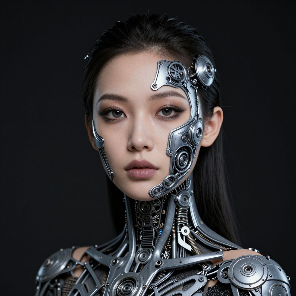 Digital artwork of a beautiful Asian woman with cybernetic facial and neck enhancements, featuring metallic gears and circuits against a dark background.