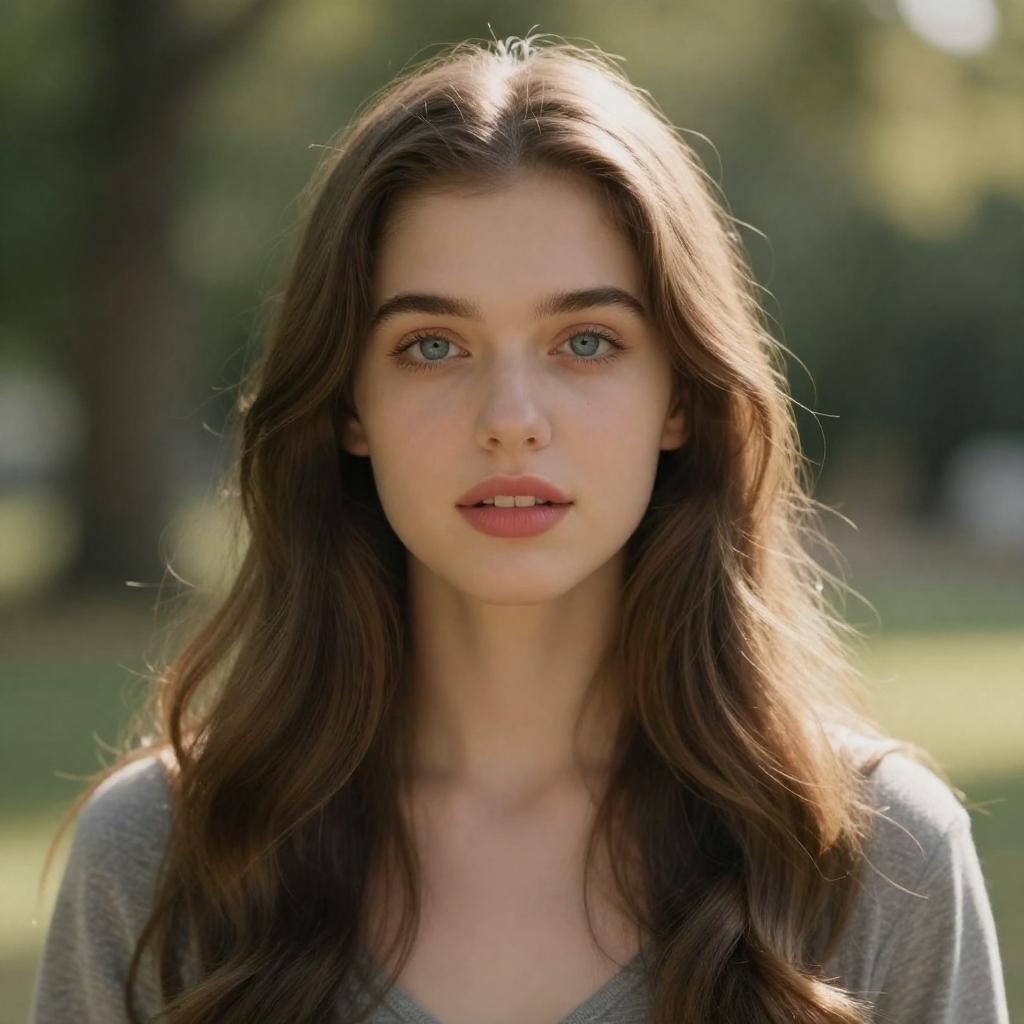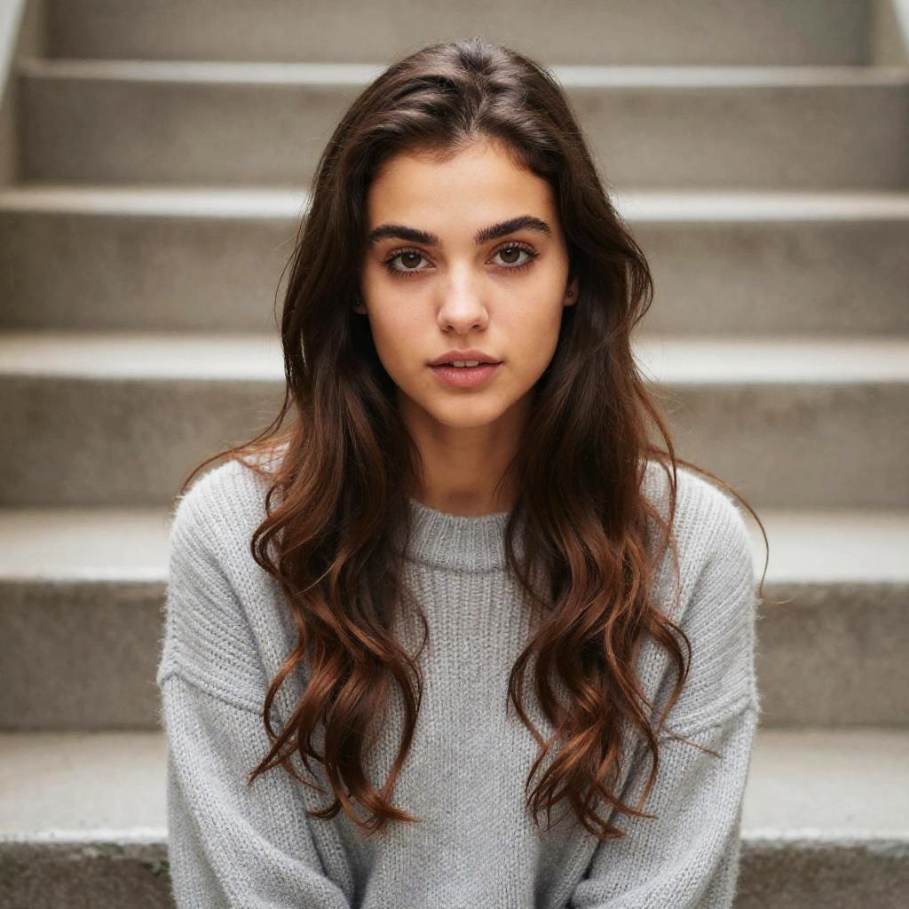 A young woman with long wavy brown hair and striking eyes poses outdoors in front of a staircase. She wears a cozy grey knitted sweater, captured in a natural, candid portrait style with soft lighting.