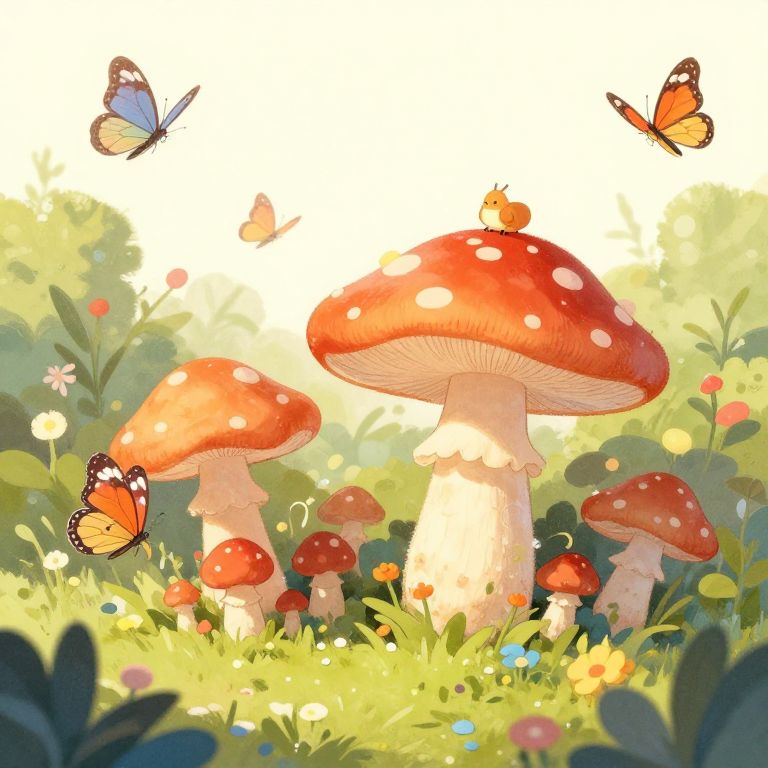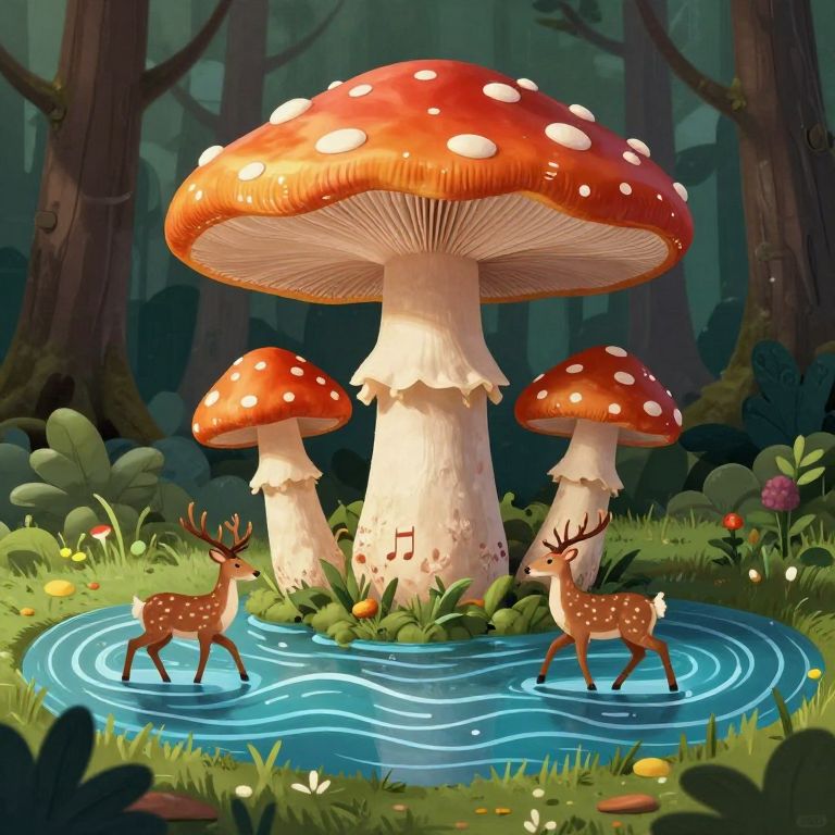 Forest mushrooms grow into oversized vibrato signs, where deer ride acoustic waves on a sound-lake shaped by the wind's melody.