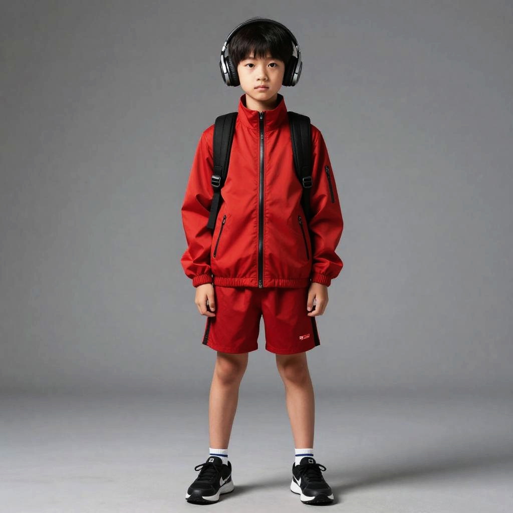 Masterpiece, best quality, 8k, official art, cinematic light, ultra high res, 1boy, red jacket, shorts, black hair, headphones, backpack, standing, full body