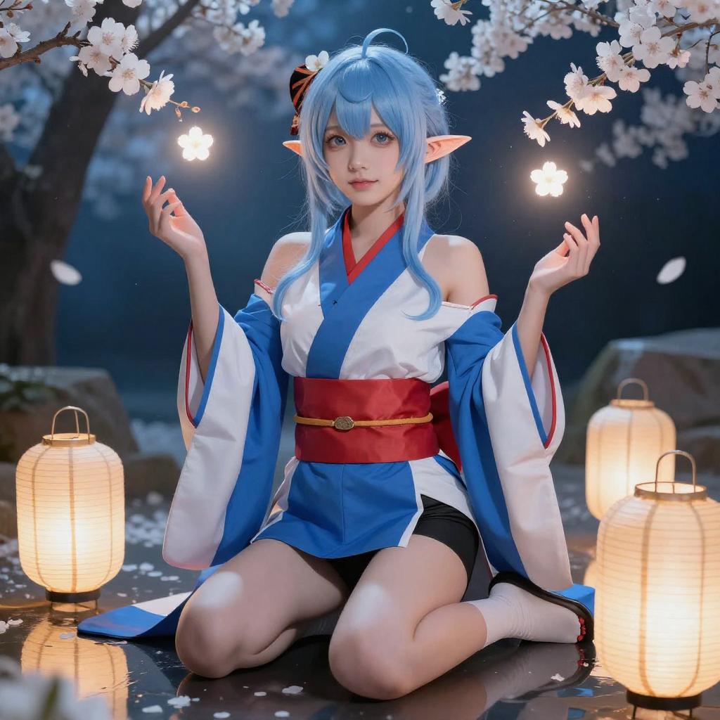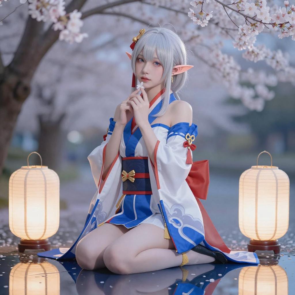 Digital artwork of a nude, anime-style female character with silver hair, elf ears, and white thigh-high stockings, kneeling on a blue-tinted floor. She poses seductively with arms raised, surrounded by cherry blossoms, a glowing lantern, and white flowers.