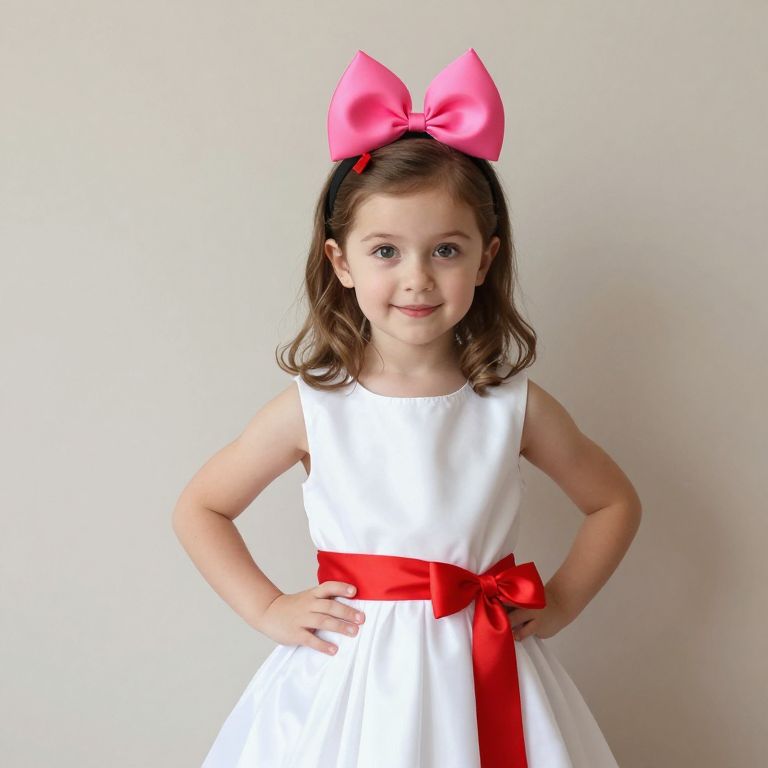 Photograph of a young girl with light skin, brown shoulder-length hair, and brown eyes. She is wearing a sleeveless, white satin dress with a bright red ribbon tied around her waist. A large, pink satin bow adorns her head. She stands against a plain, light gray background with her hands on her hips and a slight smile on her face. The dress's texture is smooth, and the red ribbon contrasts vividly with the white fabric. The overall style is simple and sweet, emphasizing her innocence and charm.