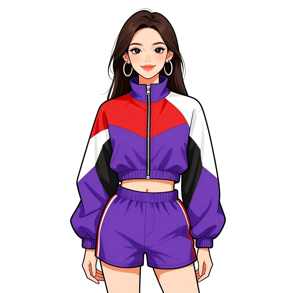 Woman with pretty face and pretty hair. smiling Woman, sporty chic, cropped color-block windbreaker jacket in red, black, and white, high collar, zipper front, elastic drawstring waist, long sleeves with elastic cuffs, matching high-waist shorts, ruched with elastic hem, large hoop earrings, straight hair, light makeup, white studio background. --sref 1461