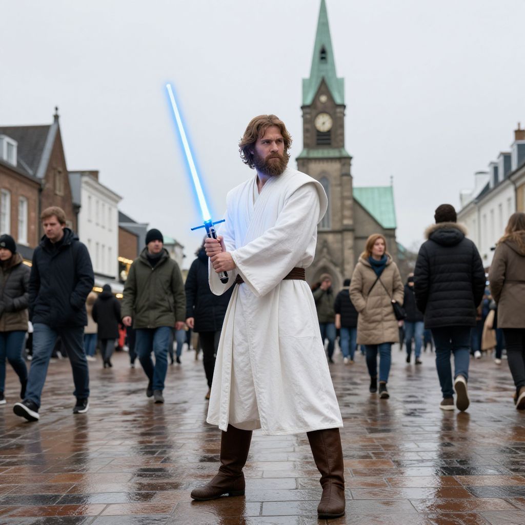 A digitally enhanced photograph of a bearded man with wavy brown hair, dressed in a white Jedi robe and brown boots, holding a glowing blue lightsaber in a busy town square. Behind him is a tall, green-roofed church with a clock tower. People in winter clothes walk around, and the ground is wet, reflecting the overcast sky.