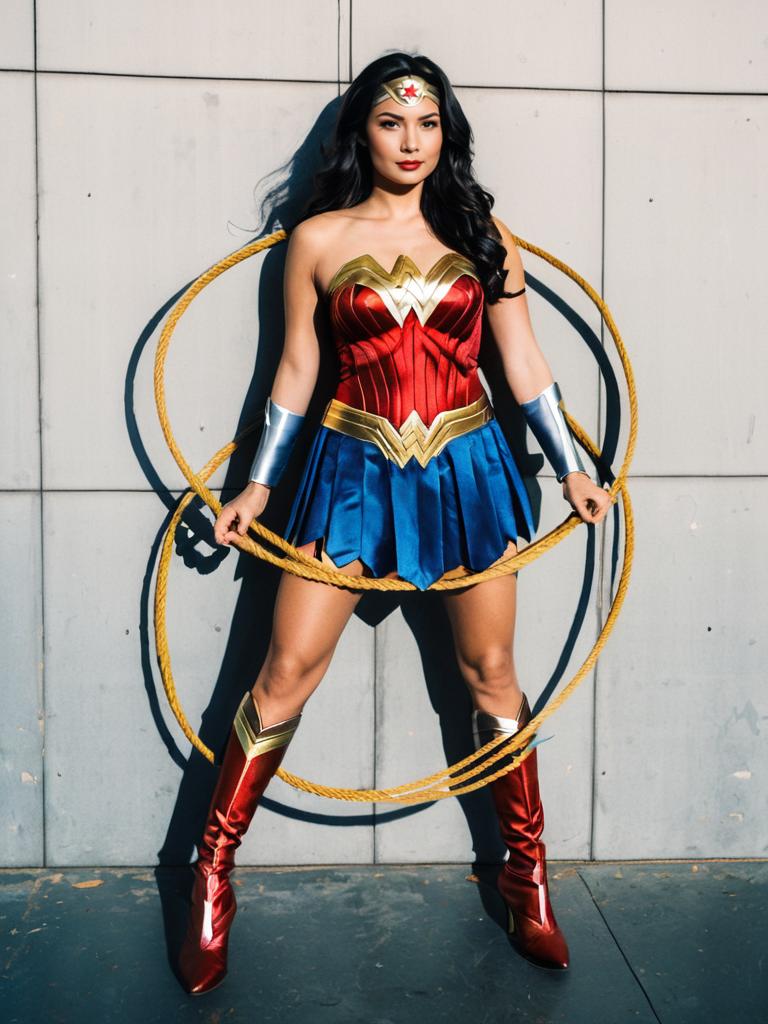 Woman in Wonder Woman Costume, full-body cosplay photo with lasso and armor --sref 1400