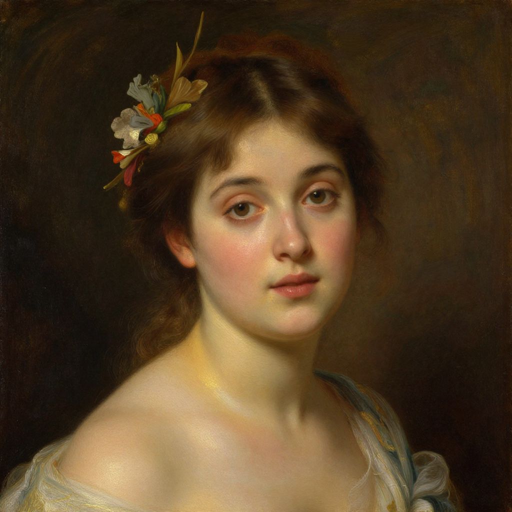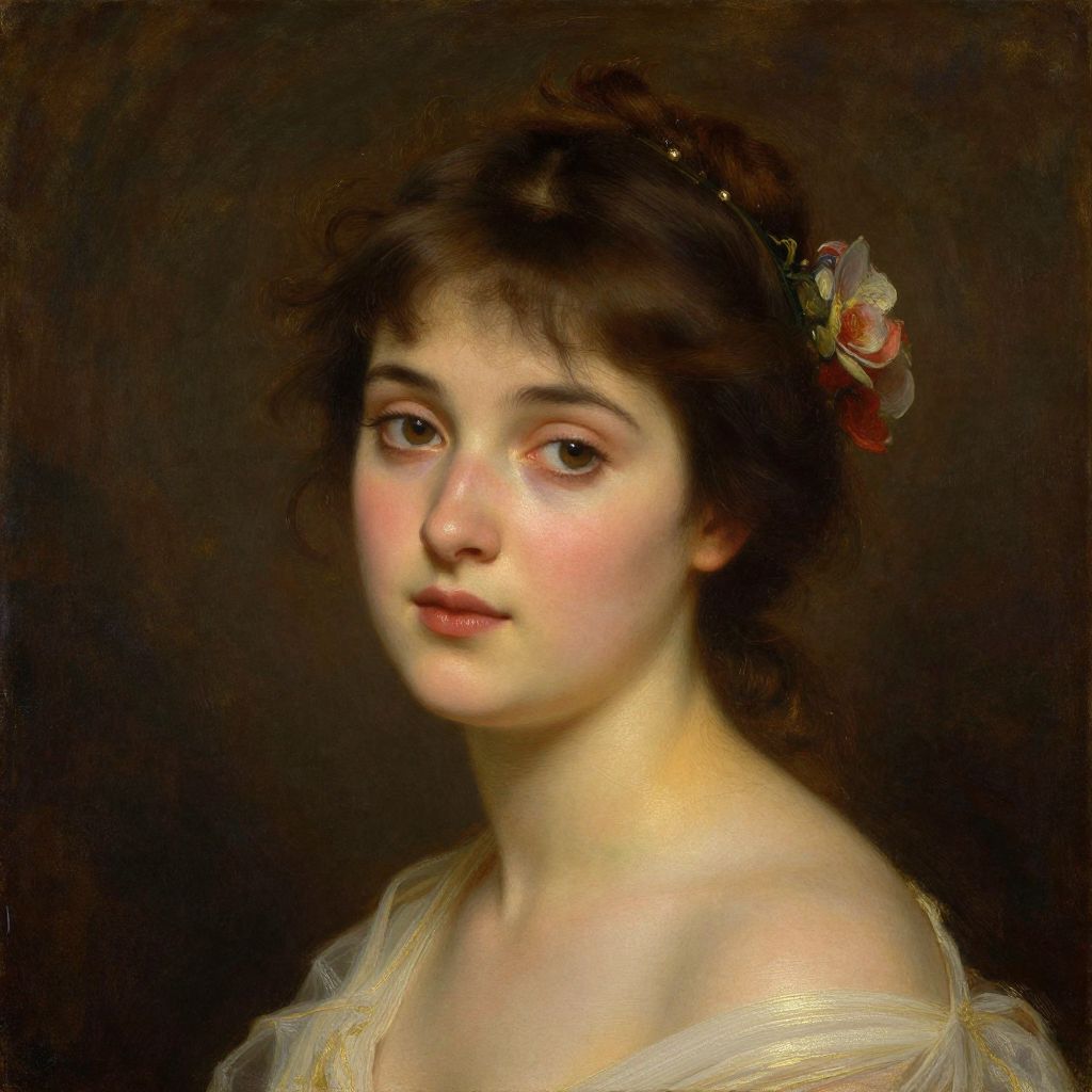 A classical oil painting reminiscent of Adolphe William Bouguereau's style, featuring a woman with softly illuminated skin and delicate features, adorned with a floral accessory in her hair, set against a dark background with warm, golden lighting that enhances the vintage and high-definition quality of the artwork.