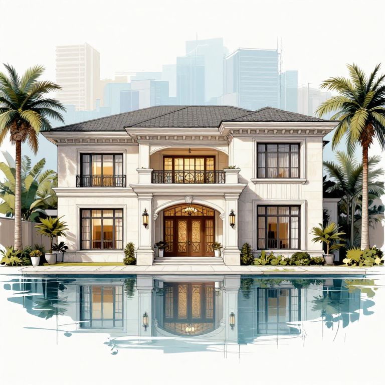 This digital illustration depicts a luxurious, two-story, white stucco mansion with a dark gray, gabled roof. The house features large, rectangular windows with black frames and ornate, wrought-iron balconies on the upper floor. A grand, arched wooden door with intricate glass panels is centered at the front, flanked by two black lanterns. The mansion is reflected in a pristine, rectangular swimming pool in the foreground. Tall, lush palm trees frame the house on both sides, adding a tropical feel. The background shows blurred, tall skyscrapers, suggesting an urban setting. The sky is clear, enhancing the bright, sunny ambiance of the scene.