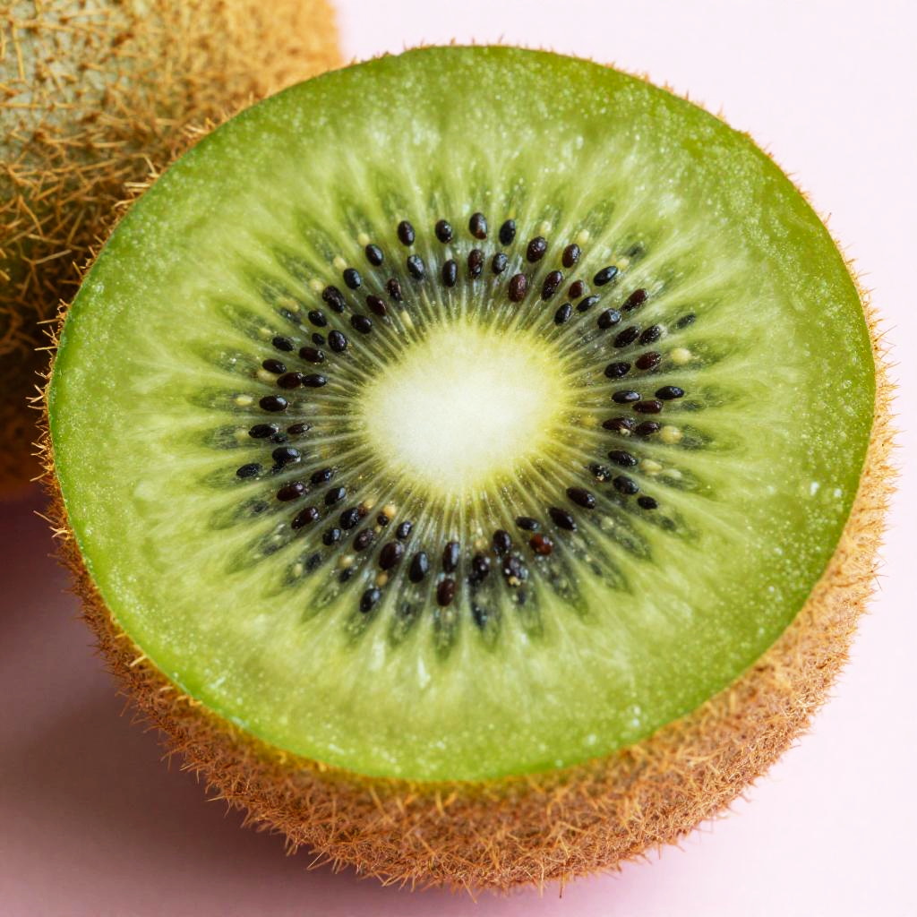 Photograph of a cross-section of a kiwi fruit. The image shows a vibrant green, juicy interior with a bright white center surrounded by a pattern of small, black, oval seeds radiating outward. The outer edge of the kiwi is covered in fine, brown, fuzzy skin. The background is a gradient of white to pink, with another partially visible kiwi fruit on the left side. The texture of the fruit's interior appears smooth and juicy, contrasting with the rough, fuzzy texture of the skin. The photograph is highly detailed and colorful, emphasizing the freshness of the kiwi.