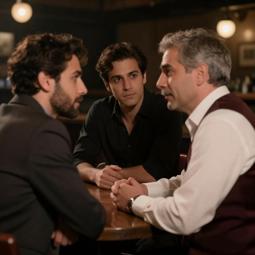 Photograph of a dimly lit theater with several people seated in rows. Two men in dark suits and ties sit in the foreground, both with dark hair and serious expressions. The man on the left has a beard. Background includes blurred figures and a bright screen. The lighting creates a moody atmosphere.