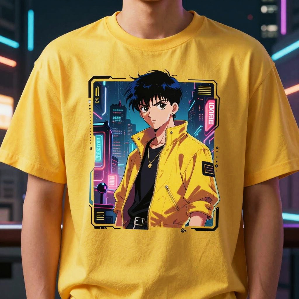 Yellow anime shirt highlighted on a futuristic cyberpunk character with neon city backdrop, detailed fabric texture glowing under the city lights, blending traditional anime aesthetics with sci-fi elements for a striking visual.