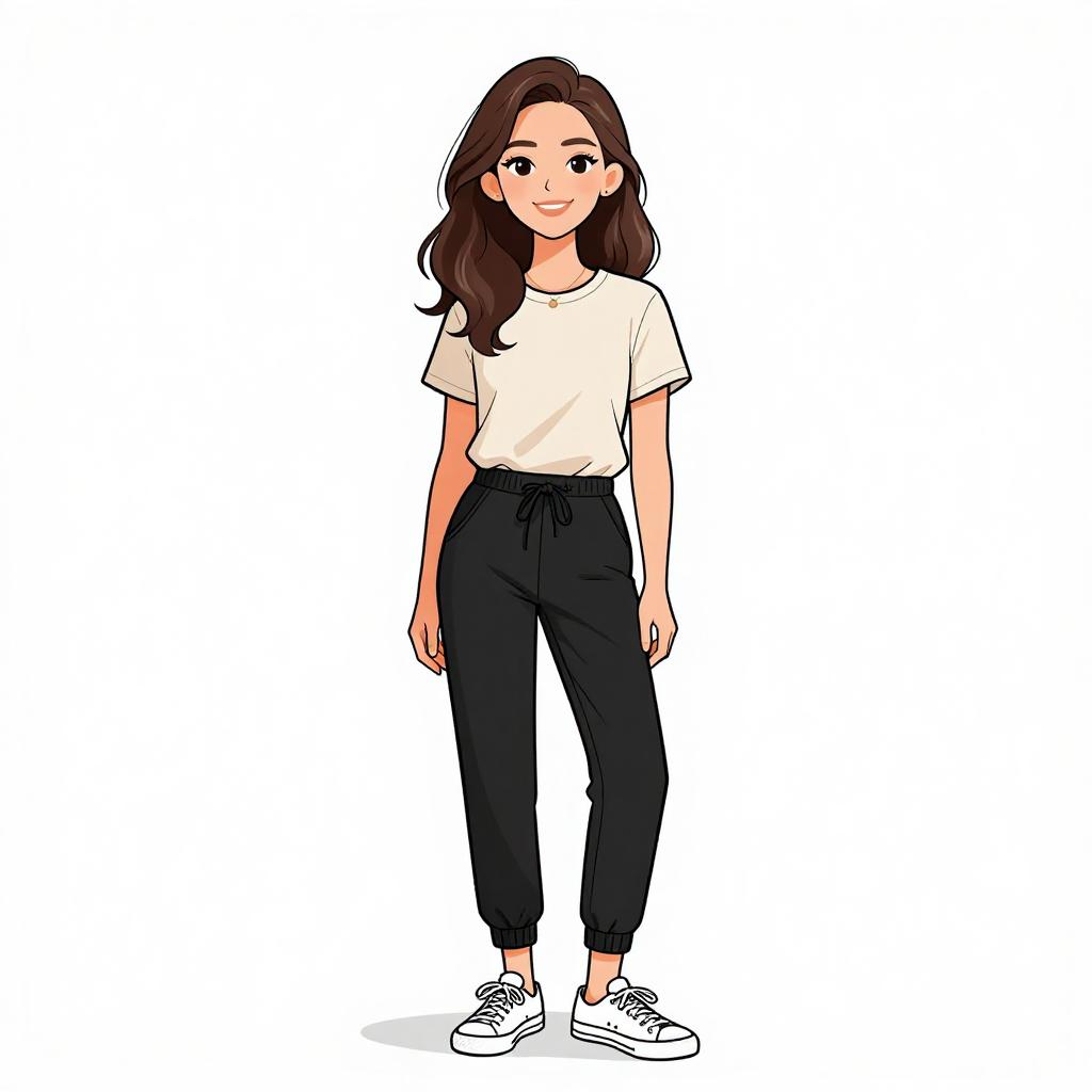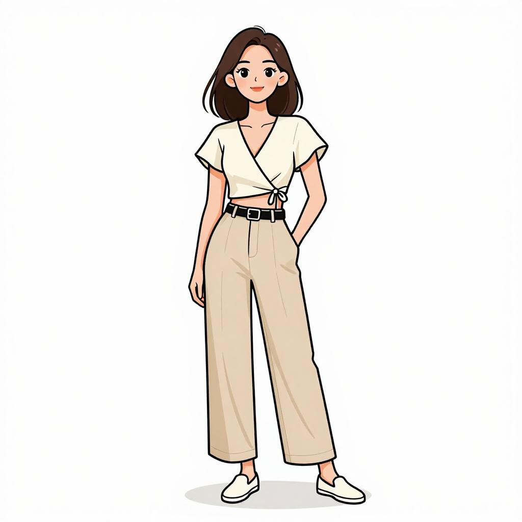 Woman with pretty face and pretty hair. smiling Woman, business casual, linen blend pantsuit in neutral beige, relaxed fit, single-button blazer, notched lapels, flap pockets, coordinating straight-leg trousers, white crew-neck T-shirt, minimal jewelry, white low-top sneakers, plain white studio background. --sref 1467