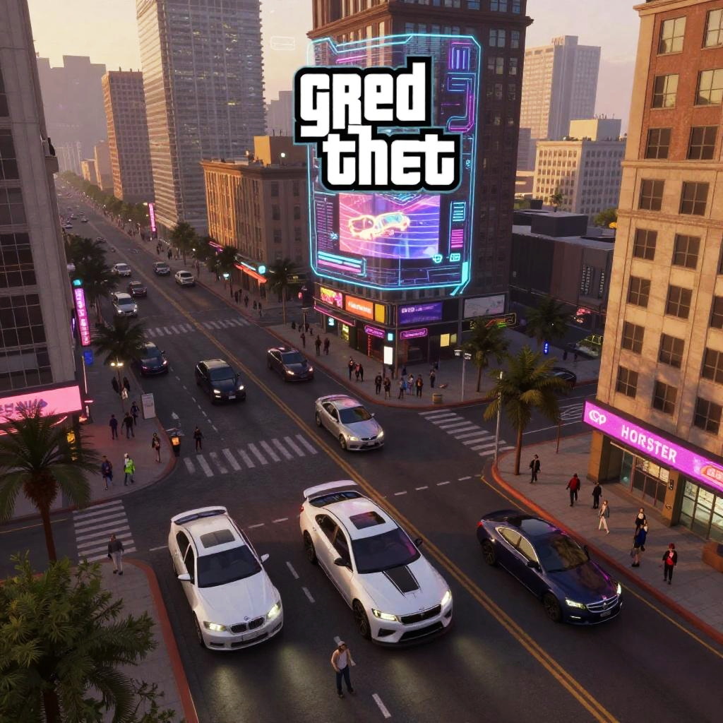 GTA AI art depicting an aerial view of a detailed cityscape with AI-generated futuristic vehicles and pedestrians, dusk lighting with warm tones, cyberpunk style with holographic advertisements, sharp focus on design elements, vibrant and lively scene