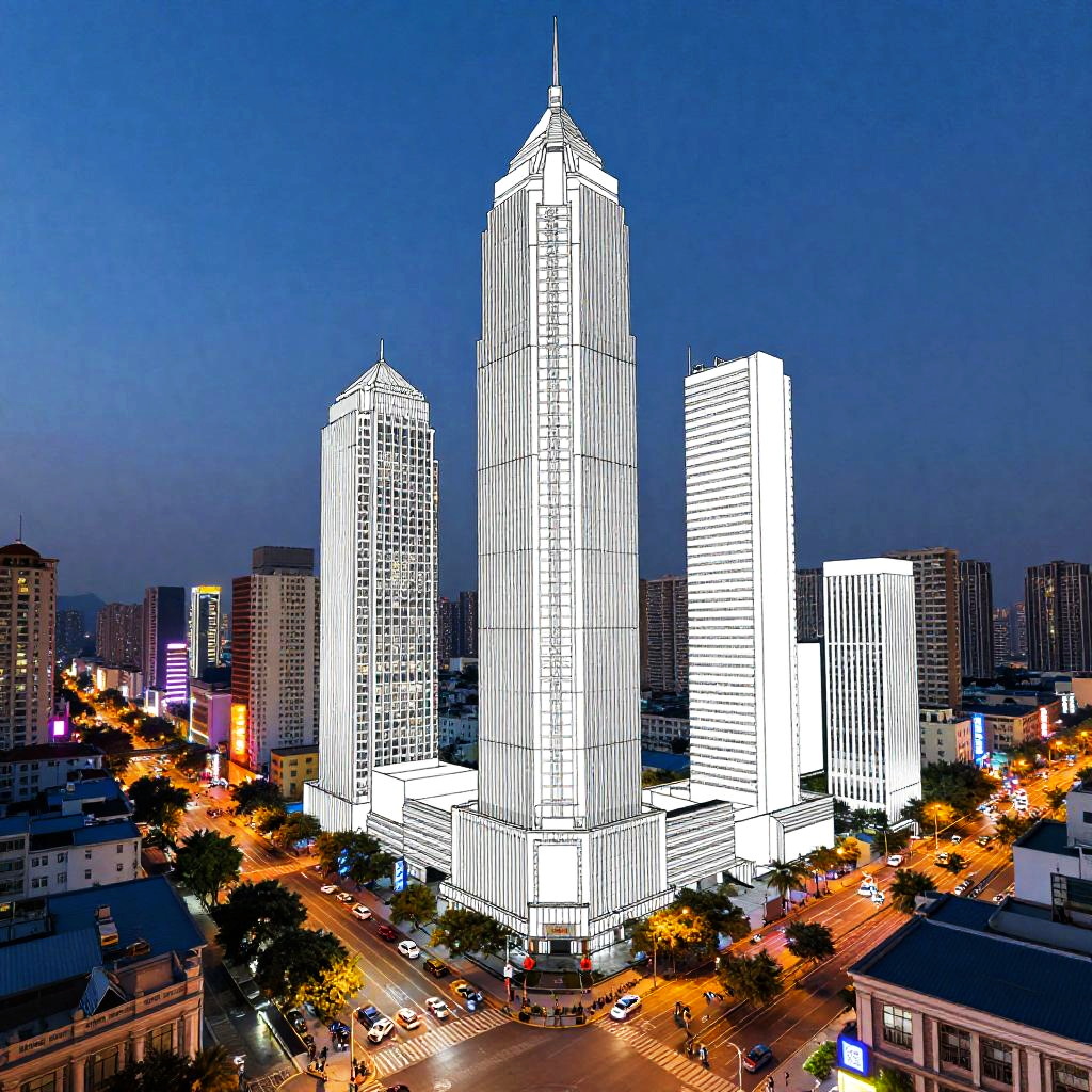 Digital art of a cityscape at dusk, featuring three illuminated, white, vertically-striped skyscrapers with vibrant, orange streetlights below.