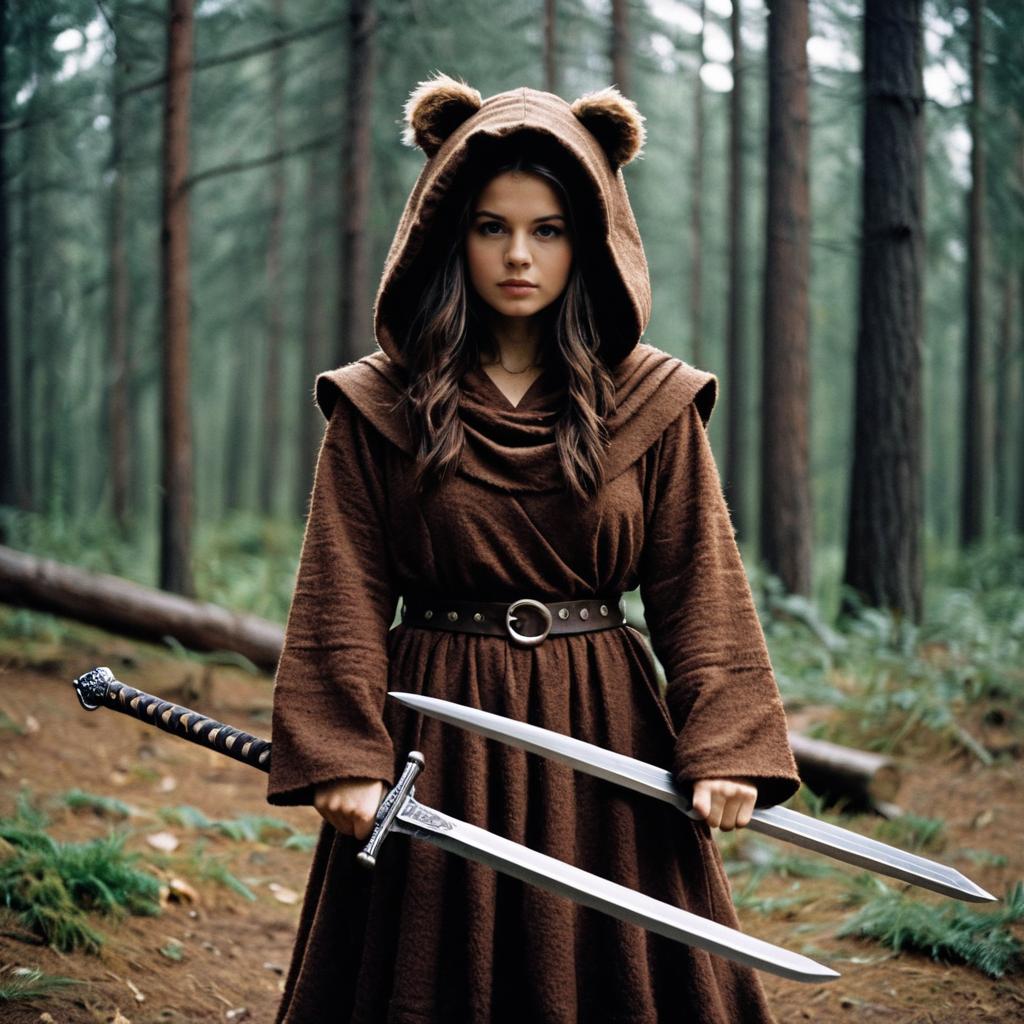 Woman Ewok Dress, dressed in a brown outfit with a bear hood and a sword