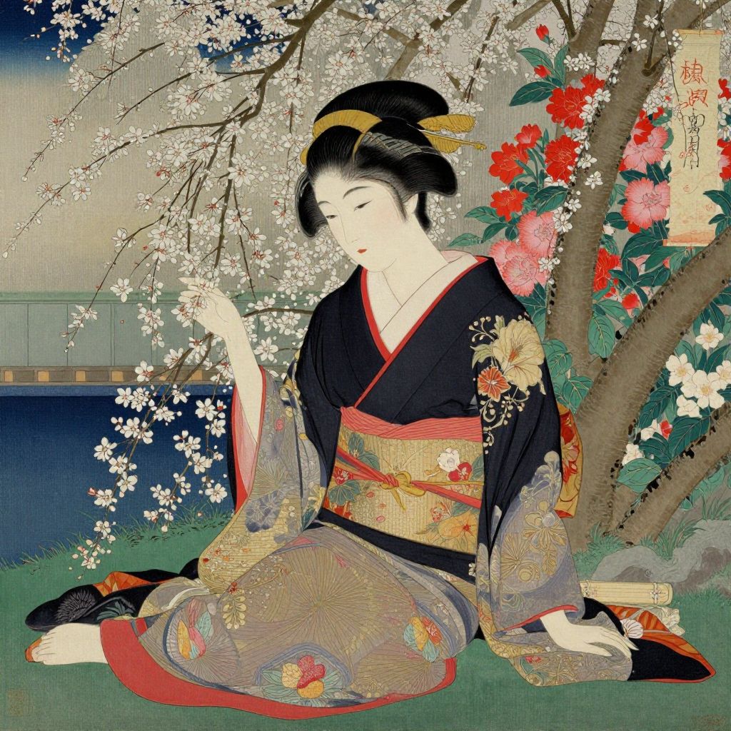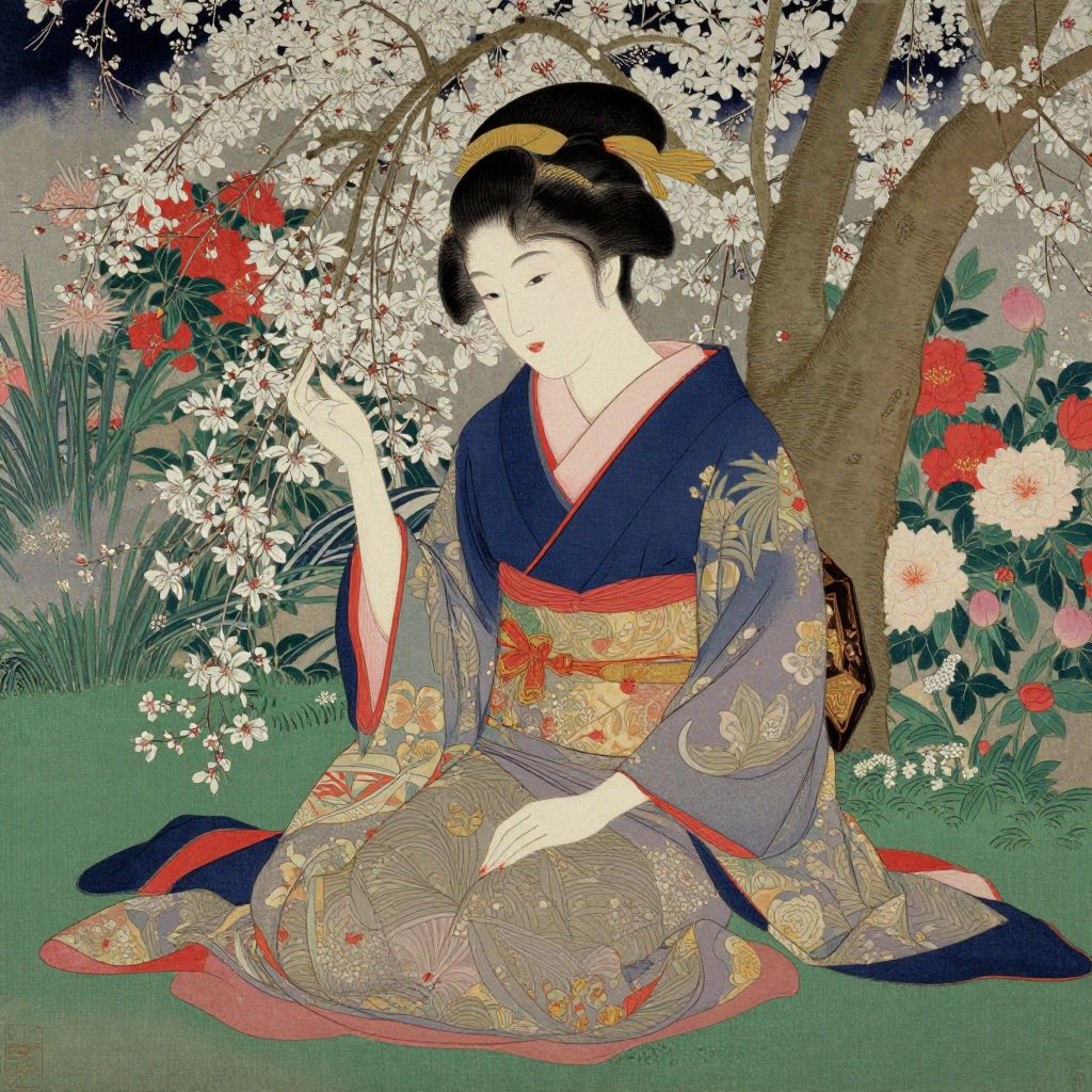 Seated gracefully amidst delicate white blossoms, a woman in traditional Japanese attire exudes elegance and serenity, her poised demeanor framed by vibrant floral surroundings in \"Beauty of Ancient Times\" by Ito Shinsui (1898 - 1972).