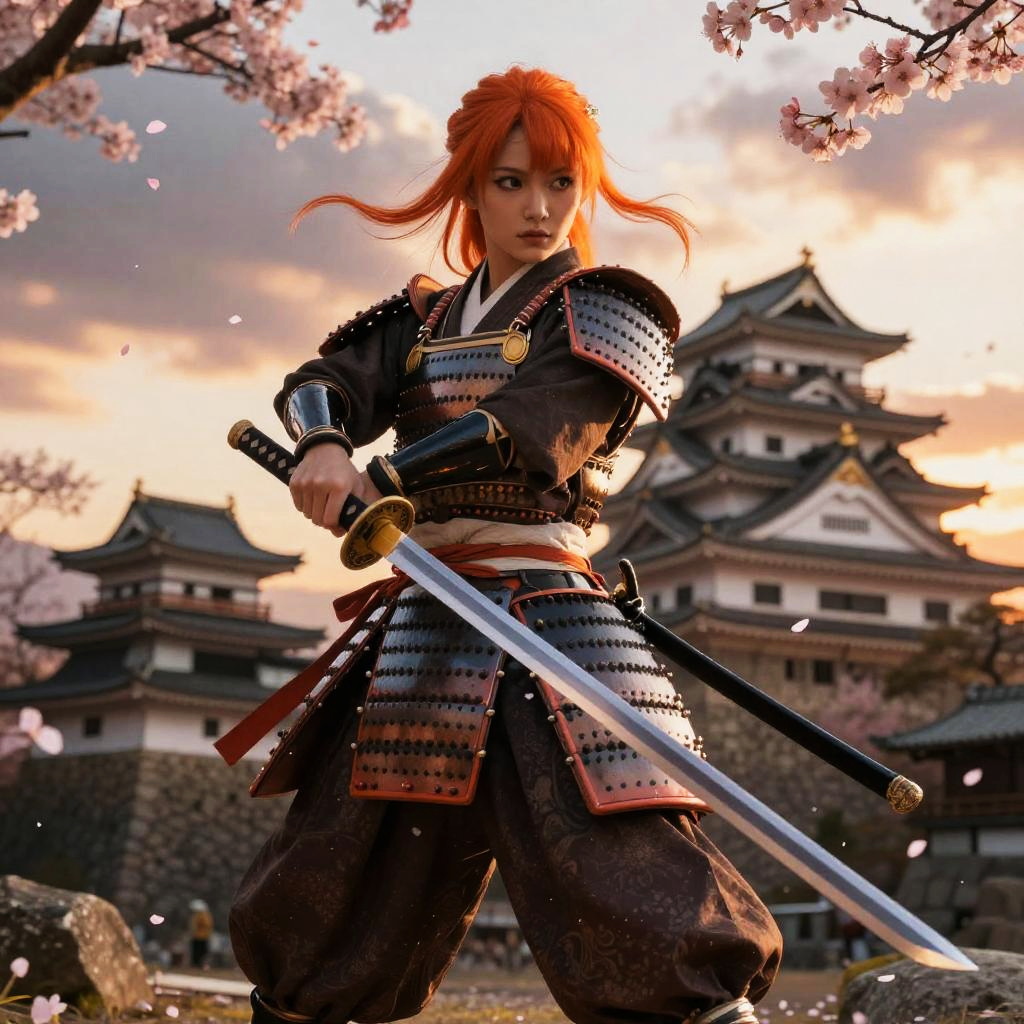 Nami samurai outfit, a fierce and elegant female warrior in traditional Japanese armor with flowing orange hair, detailed katana sword, cherry blossom petals floating around, backdrop of ancient Japanese castle under a dramatic sunset sky, dynamic pose.