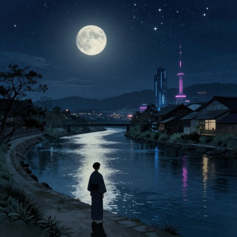 Visualize an exquisite digital artwork that harmoniously blends the serene tranquility reminiscent of Hiroshige's woodblock prints with the enigmatic charm found in Edward Hopper's nocturnes. This captivating scene unfolds from a unique 'bug's-eye view', where a solitary figure draped in traditional attire stands beside a river bathed in moonlight, its reflection dancing like liquid mercury under a canopy of twinkling stars. The peaceful atmosphere is subtly disrupted by the faint glimmers of neon lights and futuristic structures emerging from the hazy horizon, merging the timeless beauty of Japan's past with the technological marvels of an imagined future to create a harmonious fusion that evokes both longing for yesteryears and excitement for what lies ahead.