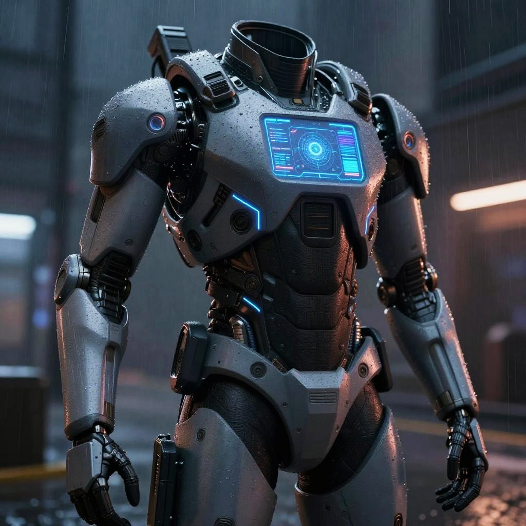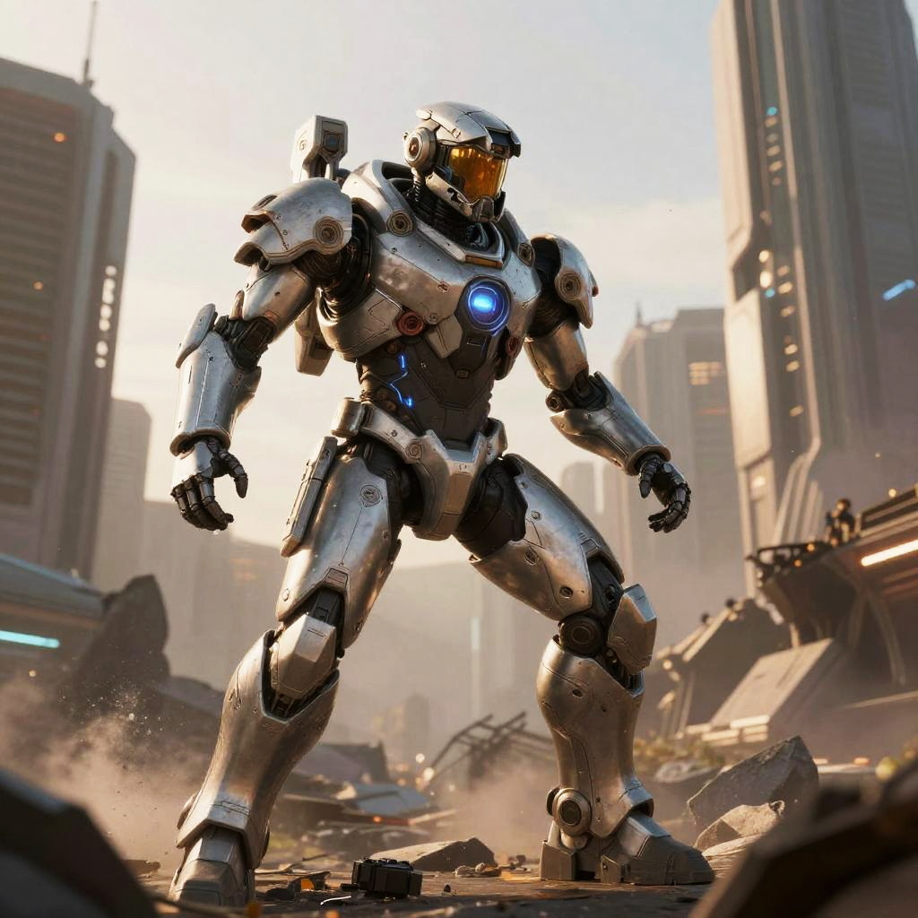 Futuristic combat suit worn by a soldier in a high-tech battlefield, sleek armor with glowing blue accents, advanced weaponry, cyberpunk city backdrop, dynamic lighting