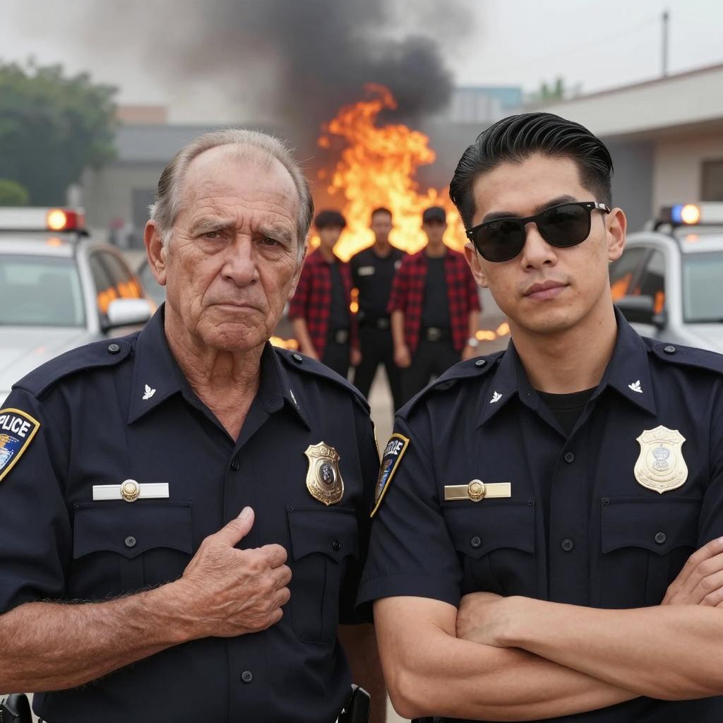 Two men in the foreground. The older man on the left has a receding hairline, wrinkled face, and a serious expression. The younger man on the right has dark sunglasses, slicked-back hair, and a confident expression. Both wear dark blue police uniforms. In the background, three people in red plaid shirts and black clothing stand near parked cars, with intense flames and smoke behind them. The older man's left hand is on his chest, displaying a badge and pin. The younger man's right arm is crossed over his chest.