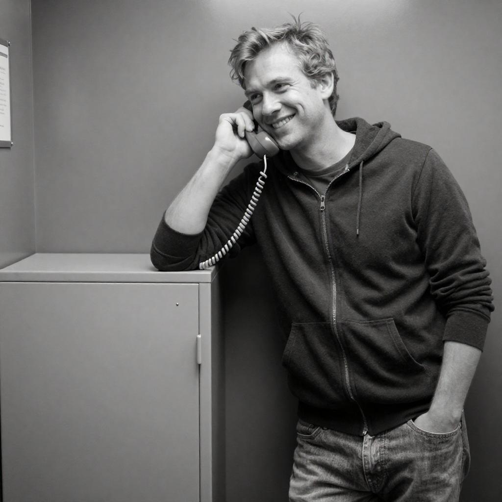 Black-and-white photograph of a smiling man with light-colored hair, wearing a dark zip-up hoodie and light jeans, leaning against a metal cabinet while talking on a rotary phone. The background features a ured metal wall. The man's right arm rests on the cabinet, and the phone cord is visible.
