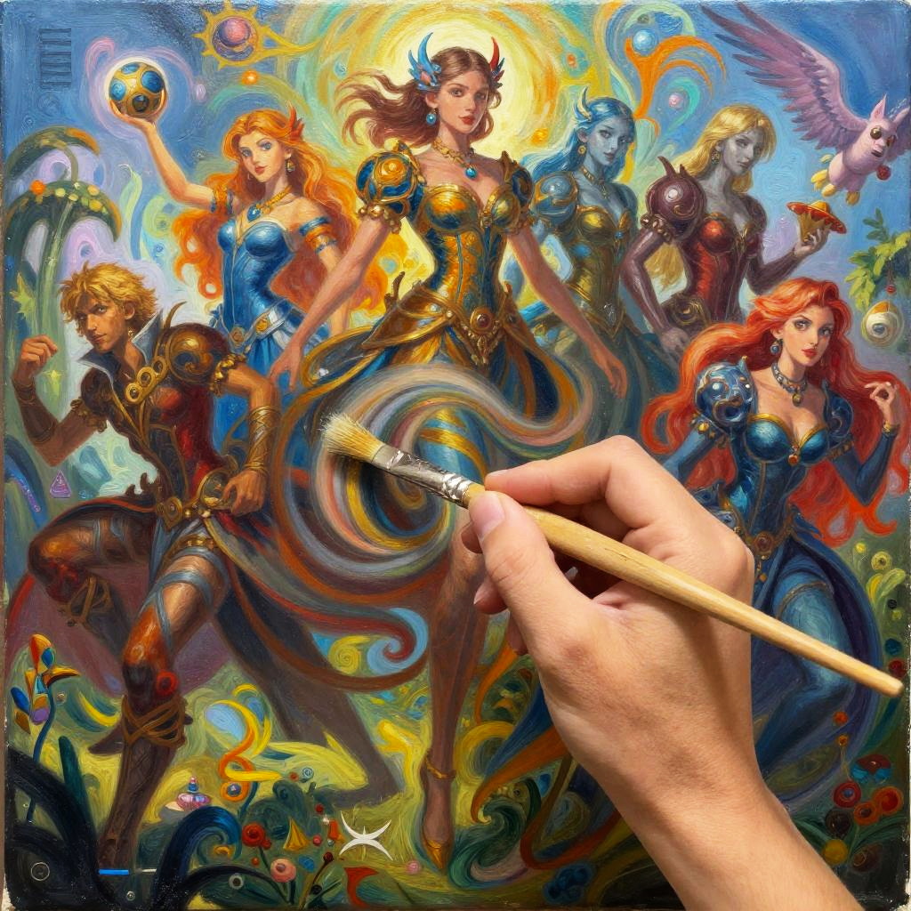 A hand holding a paintbrush creates a vibrant oil painting depicting multiple fantasy characters in colorful, detailed costumes. The surreal artwork blends swirling brush strokes and digital effects, showcasing six armored female and male warriors with distinct features and bright, flowing hair, set against a dreamlike abstract background. The scene captures artistic fusion between traditional painting and fantasy digital art.