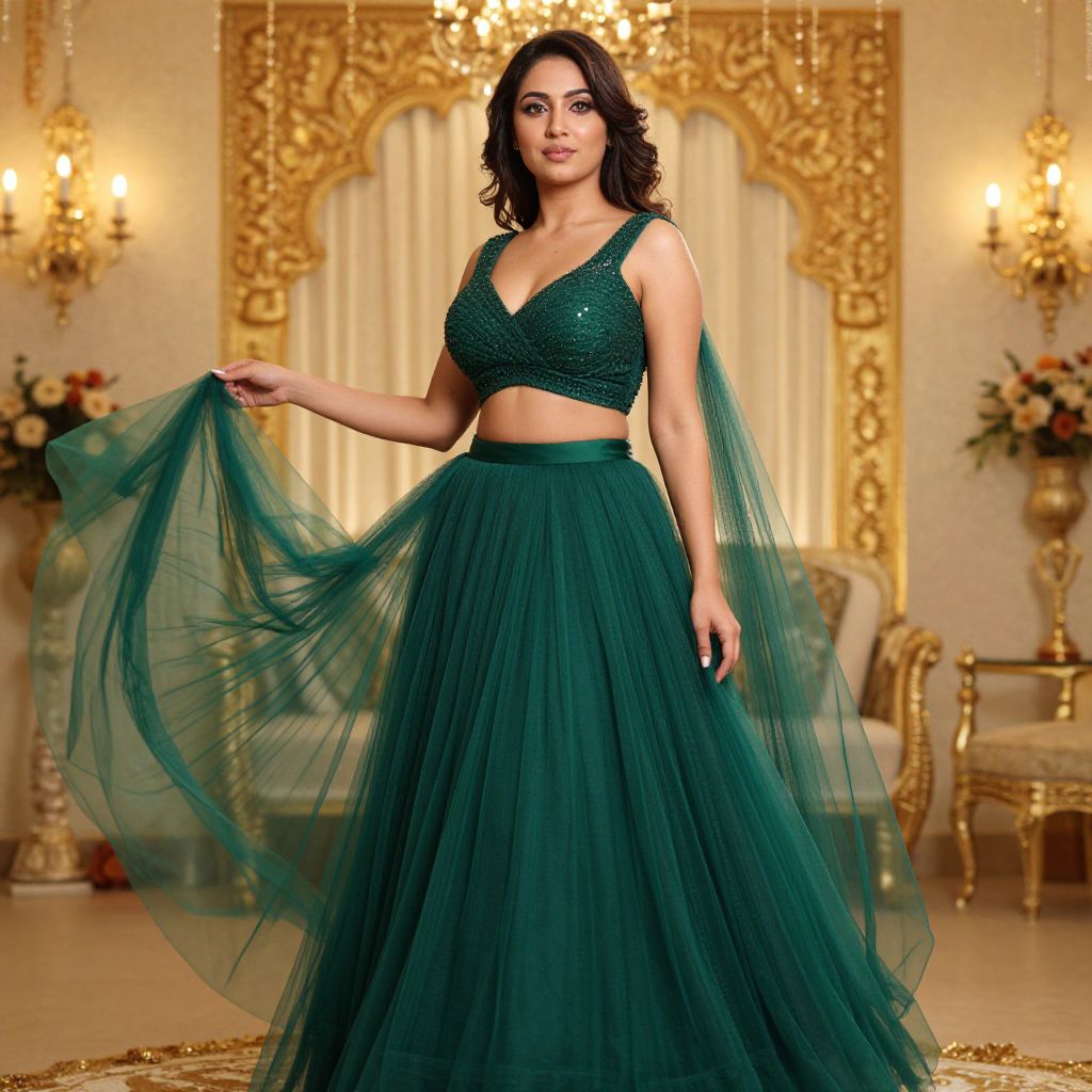 Photograph of a beautiful South Asian woman with medium skin tone, black wavy hair, wearing a green sequined crop top and flowing tulle skirt