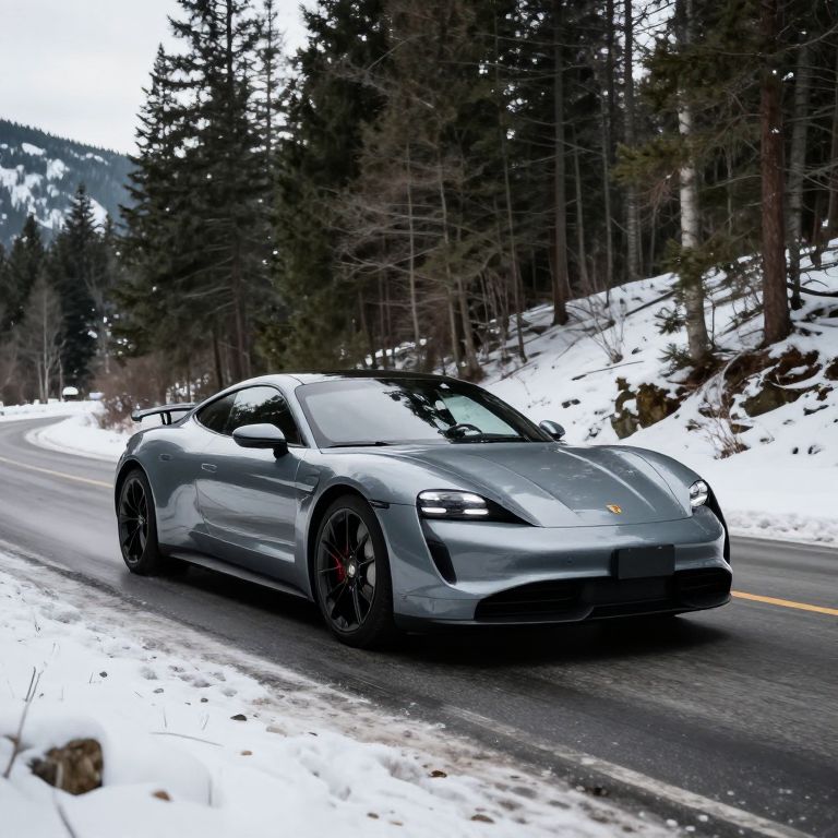 A sleek, modern luxury sports car races along a snowy, forest-lined road in Aspen, capturing the essence of a professional promotional commercial photo with dramatic, cinematic lighting and intricate details.