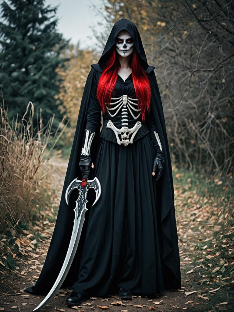 Photo-realistic cosplay photo of person in grim reaper costume. Full body. Standing. Full length. 1girl, red eyes, long hair, scythe