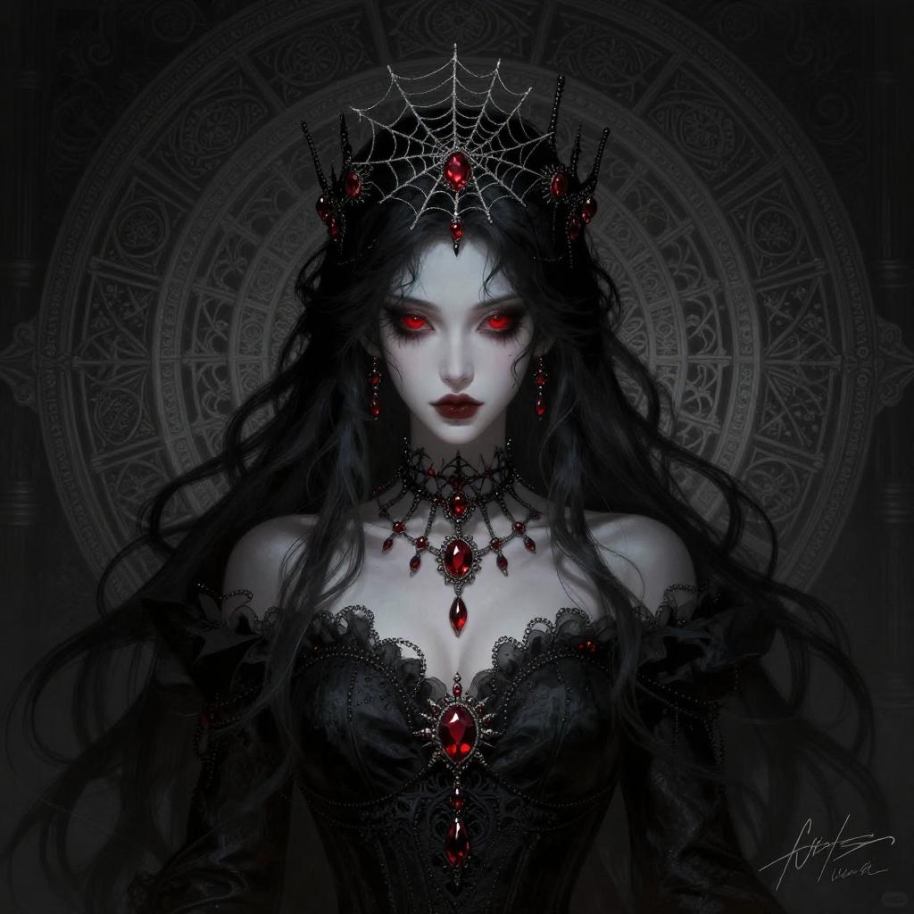 Digital art of a dark fantasy female character with pale skin, glowing red eyes, and long black hair. She wears an intricate spider web crown adorned with red gems, a detailed black gothic dress, and elaborate jewelry featuring large red gemstones. The background includes a circular ornate pattern, emphasizing the supernatural and haunting atmosphere with dramatic lighting and high contrast.