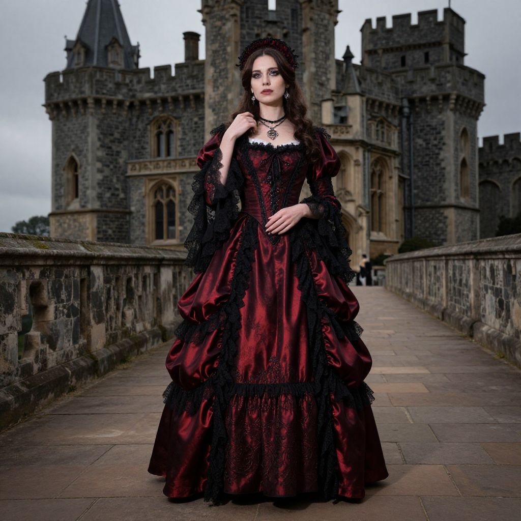 A woman dressed in an elegant Victorian Gothic style gown with black lace and deep red satin stands gracefully along a stone pathway outside a historic castle. The dramatic and moody atmosphere is enhanced by the detailed vintage architecture and her poised expression.