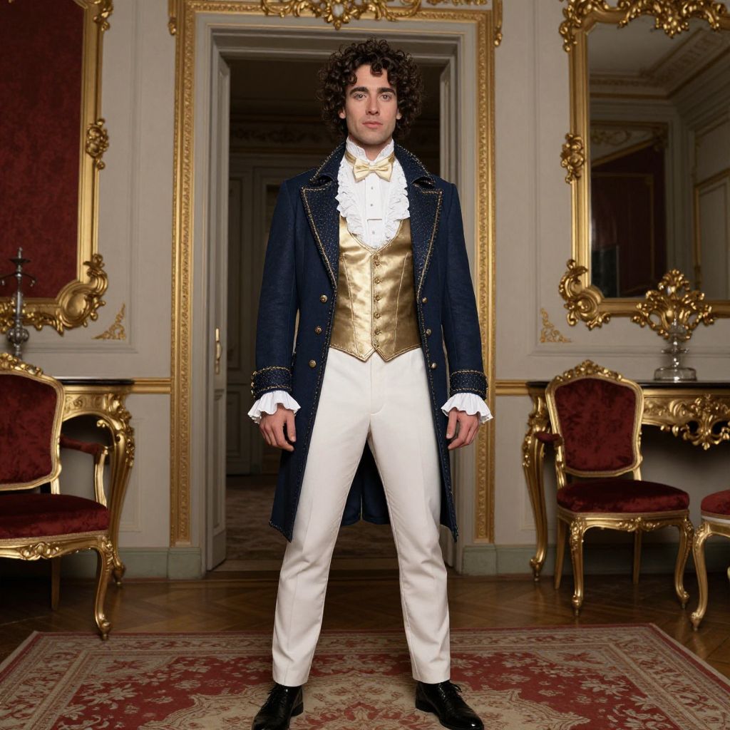 Photograph of a young man with curly black hair standing in an ornate, opulent room. He is dressed in 18th-century attire: a dark blue coat with gold trim, a white ruffled shirt, a gold waistcoat, and white pants. He wears black shoes and a white bow tie. The room features gold-framed mirrors, red velvet upholstered chairs with gold frames, and a red patterned carpet. The background includes a doorway and ornate wall decorations, creating a luxurious, historical atmosphere. The subject stands confidently in the center, facing the camera.
