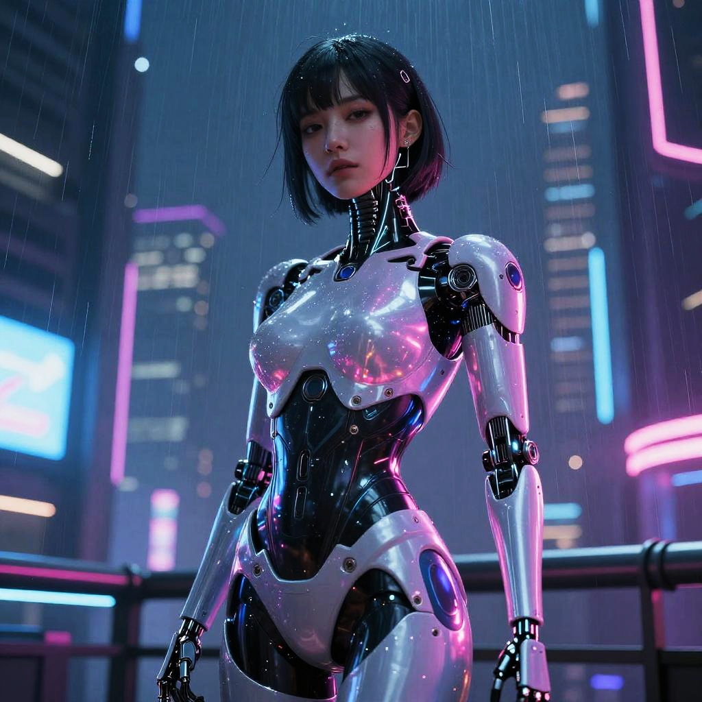 Cyberpunk CGI of a sleek, metallic, human-like female robot with black bob haircut, standing in rainy cityscape with neon lights.