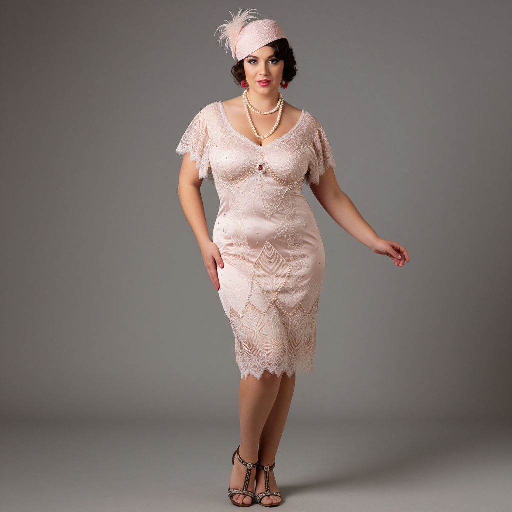 Full body shot, Curvy woman, vintage 1920s drop waist dress, soft silk fabric, intricate lace detailing, pastel pink color, flutter sleeves, beaded embellishments, knee-length hem, flapper style, matching cloche hat, delicate feather accent, pearl necklace, t-strap heels, art deco patterns, elegant and playful, retro glamour Sexy. Pretty face and beаutiful eyes. Big breasts