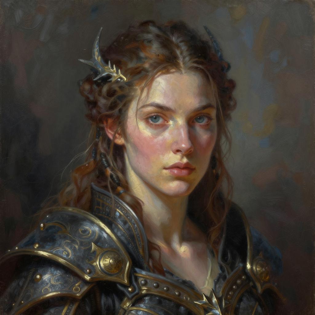 Painting of a rugged man in a black hat, wearing a metallic chest plate, blue shirt, and brown cloak. He holds a cigarette in his right hand, looking forward with a serious expression. Light brown background. Loose, expressive brush strokes.