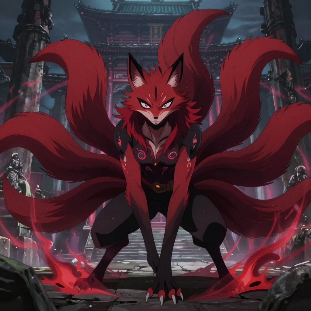 Anime fox demon character with nine fluffy tails, dark black and crimson color scheme, fierce expression, ancient Japanese temple ruins in the background, swirling mystical energy, sharp claws and glowing markings, cinematic anime scene with moody lighting.