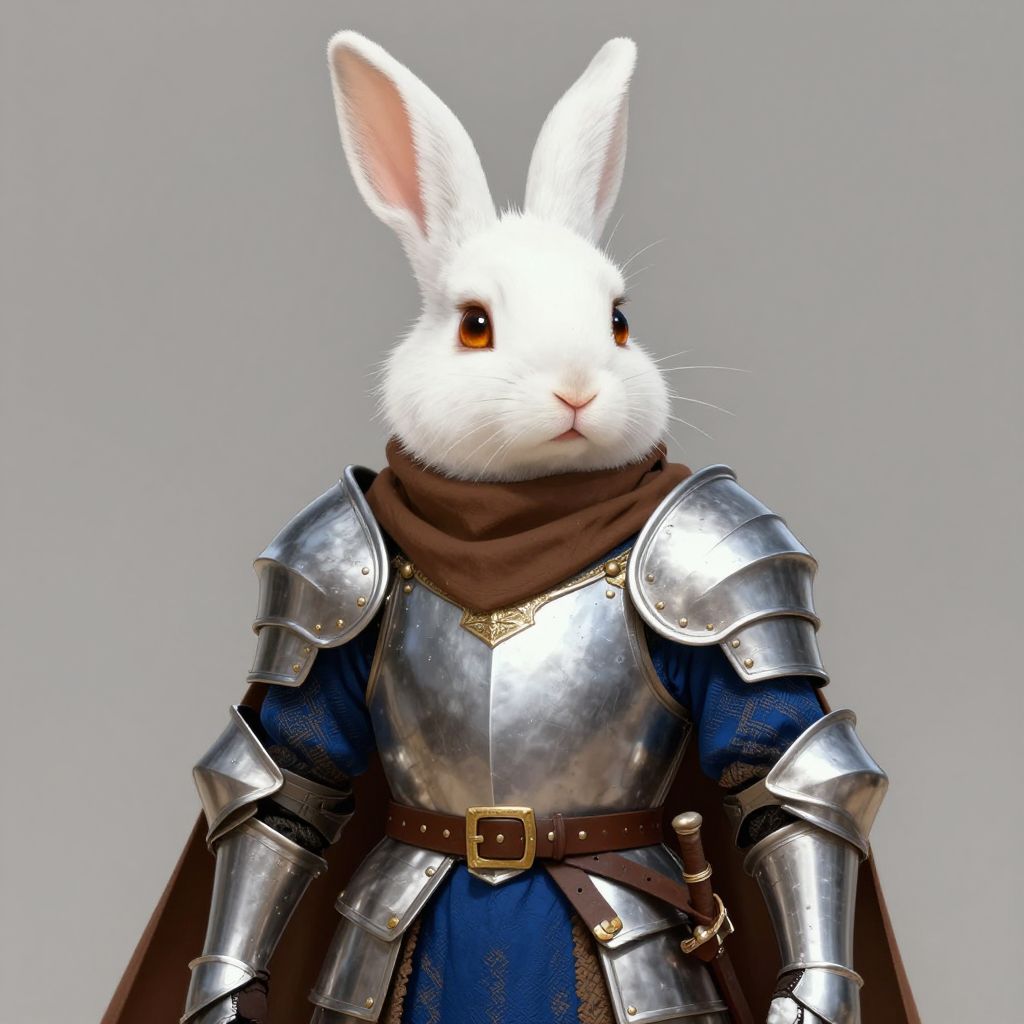 Digital artwork of a white rabbit with large, upright ears and expressive brown eyes, dressed in detailed medieval knight armor. The armor is shiny silver with intricate designs, including shoulder pauldrons and a chest plate, belted at the waist with a brown leather strap and gold buckle. The rabbit also wears a brown, fur-trimmed cloak that contrasts with the dark blue, patterned tunic underneath. The background is a simple, gradient gray, highlighting the rabbit and armor. The image has a realistic, yet slightly whimsical style, blending fantasy and reality.