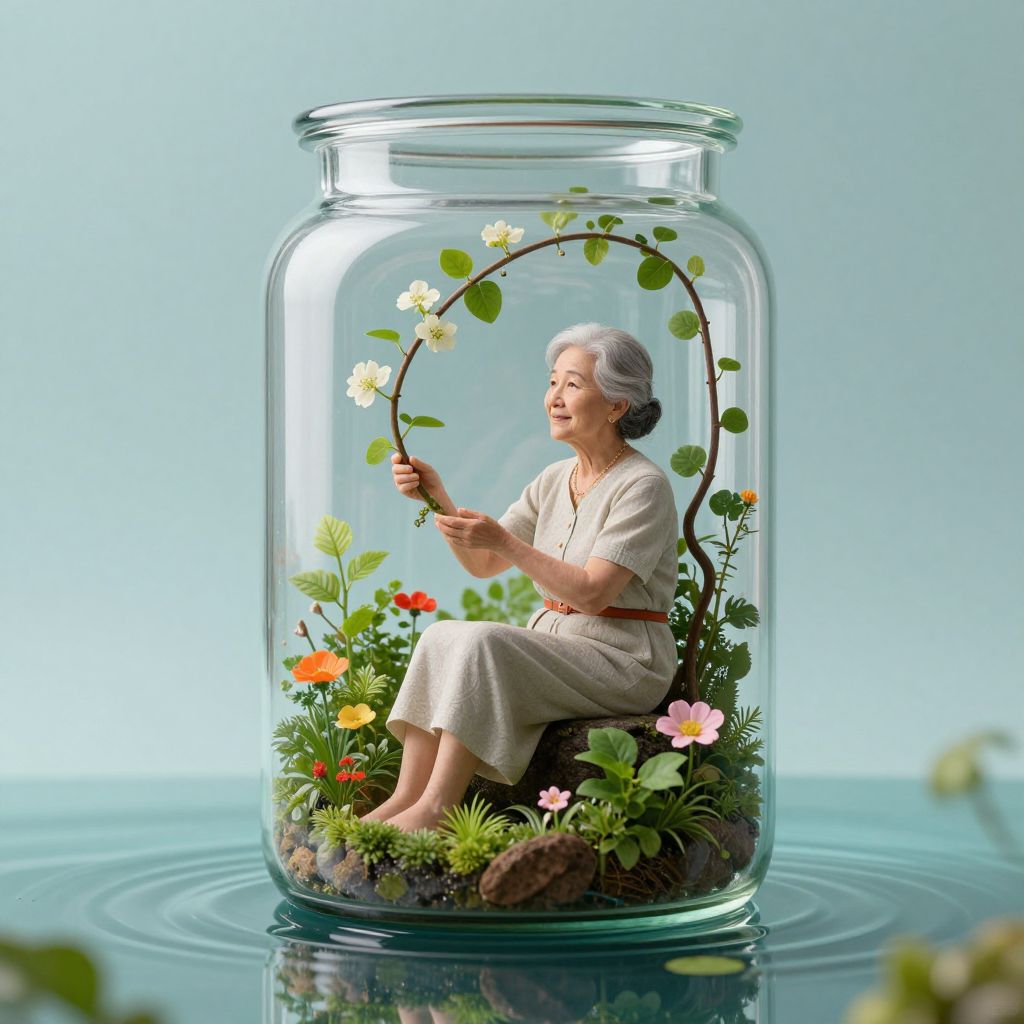 A serene elderly woman sits within a transparent glass jar, cradling a delicate, flowering vine that defies gravity, its branches weaving through a miniature, thriving ecosystem of lush greenery and vibrant blooms, all suspended above a tranquil, reflective water surface.