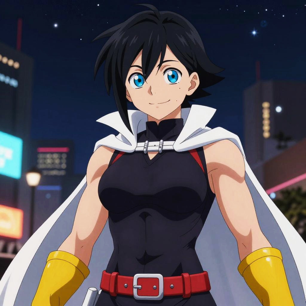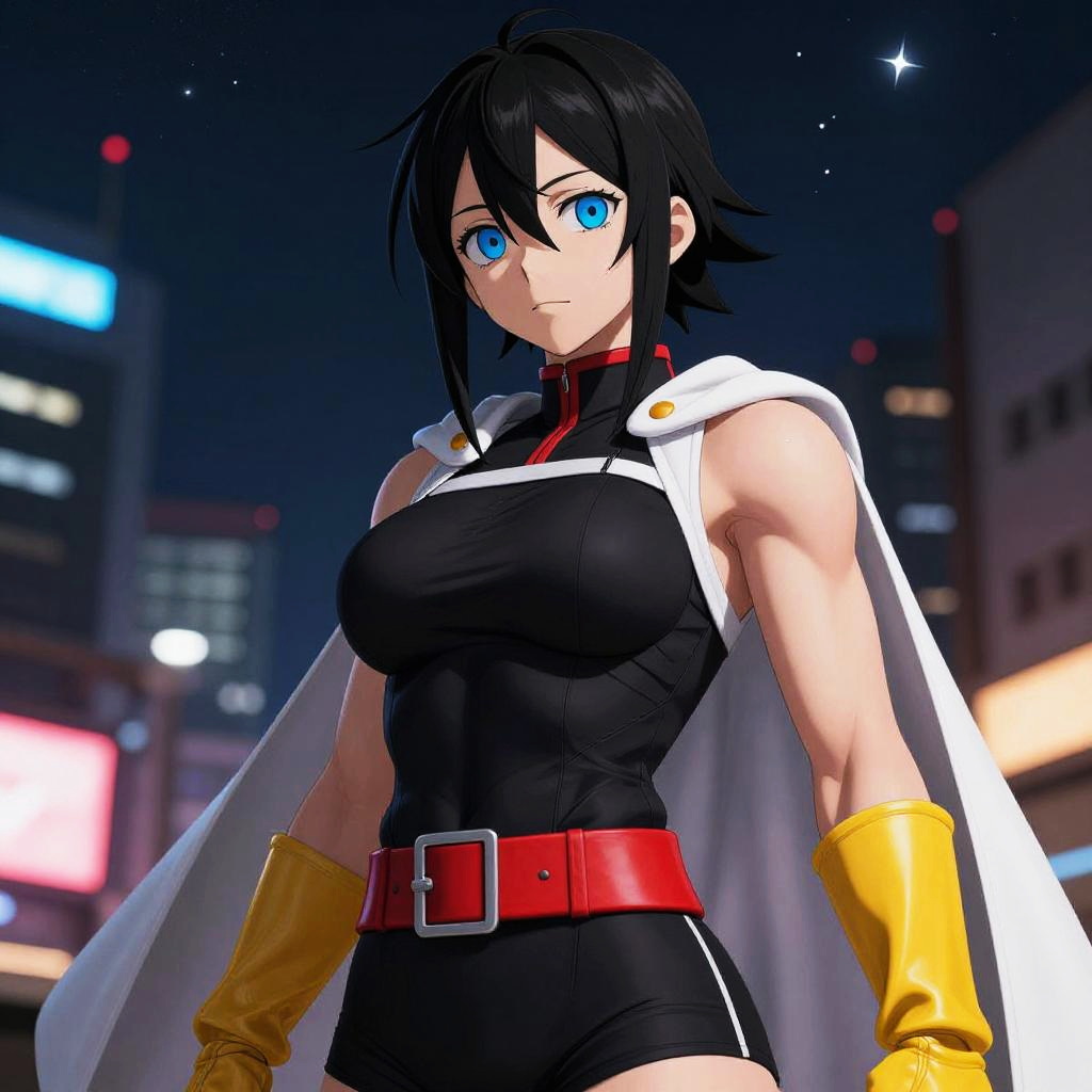 (masterpiece, best quality:1.4), cinematic light, colorful, high contrast, (1girl), NanaShimura, boku no hero academia, black hair, mole under mouth, large breasts, detailed eyes, (blue eyes), hair between eyes, sleeveless, black bodysuit, red belt, white cape, yellow gloves, in the city, night, stars, muscular female, smile